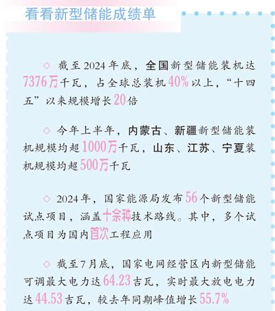 新型储能技术路线“百花齐放”,还离不开持续健全的行业标准体系。据介绍,2024年,超过20项电化学储能标准发布实施,多项标准立项,覆盖规划设计、接入电网、运行控制、检修试验、后评价等多个环节,我国新型储能标准体系建设水平进一步提升。